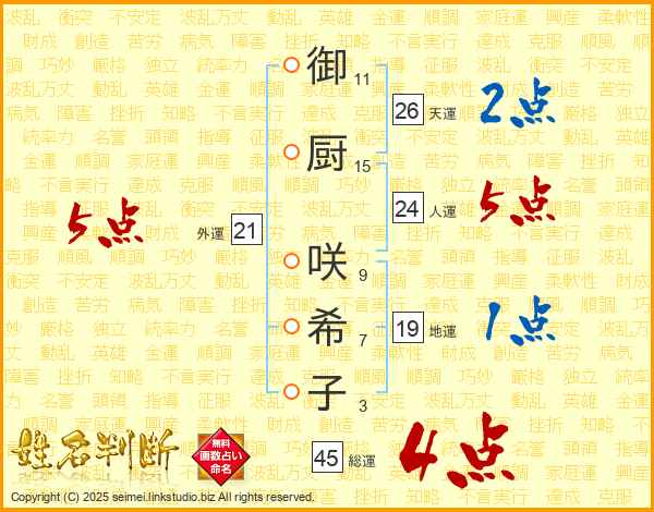 御(11画)厨(15画) 咲(9画)希(7画)子(3画)