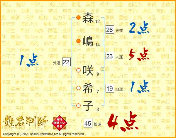 森(12画)嶋(14画) 咲(9画)希(7画)子(3画)