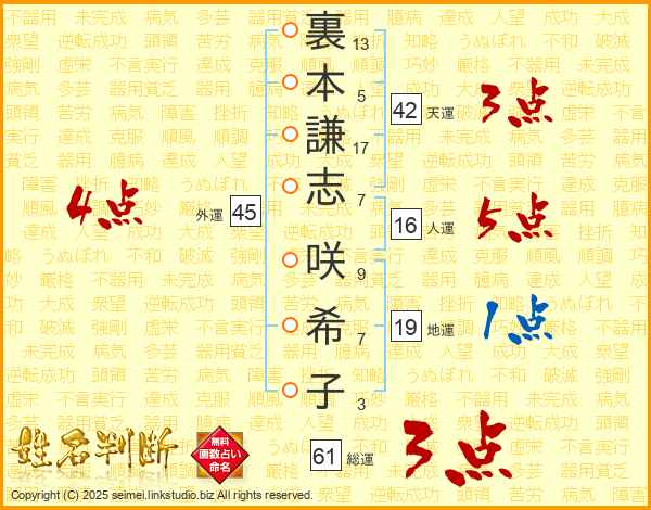 裏(13画)本(5画)謙(17画)志(7画) 咲(9画)希(7画)子(3画)