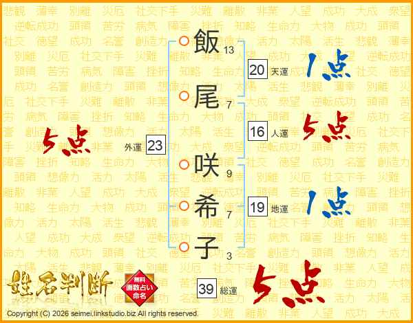 飯(13画)尾(7画) 咲(9画)希(7画)子(3画)