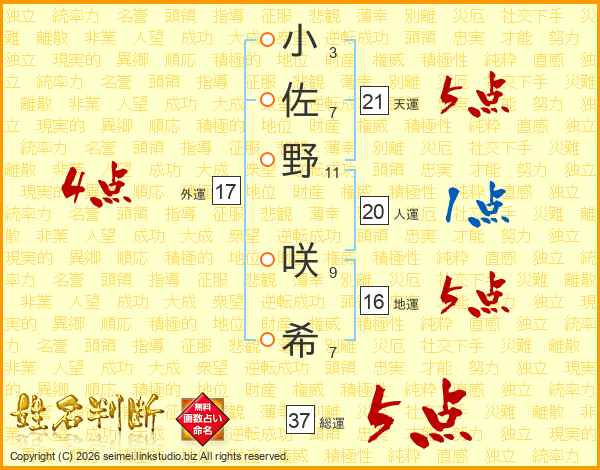 小(3画)佐(7画)野(11画) 咲(9画)希(7画)