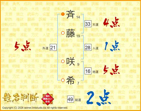 斉(14画)藤(19画) 咲(9画)希(7画)