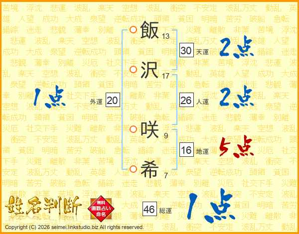 飯沢咲希さんの総運は46画の1点!