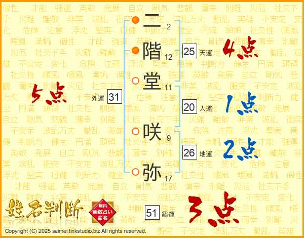 二(2画)階(12画)堂(11画) 咲(9画)弥(17画)