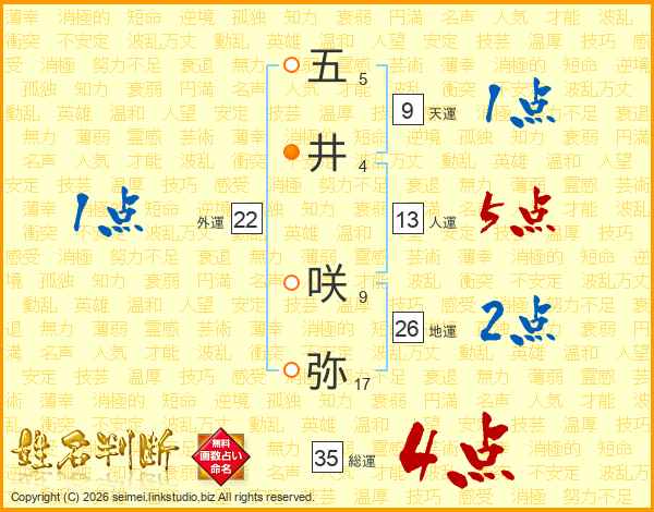 五(5画)井(4画) 咲(9画)弥(17画)
