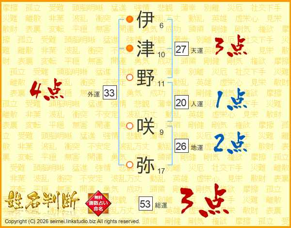 伊(6画)津(10画)野(11画) 咲(9画)弥(17画)