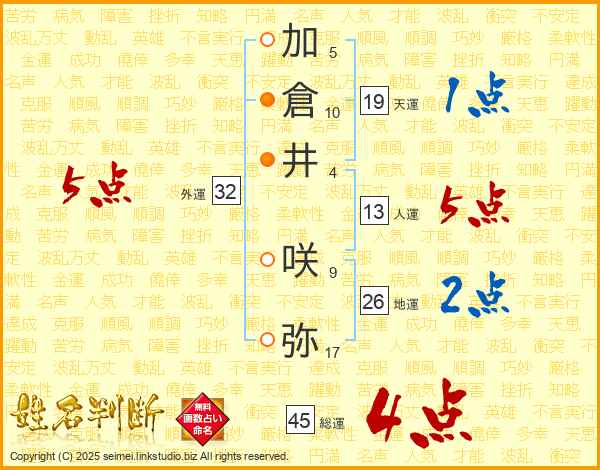 加(5画)倉(10画)井(4画) 咲(9画)弥(17画)