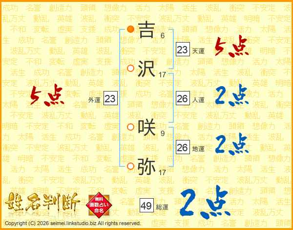 吉(6画)沢(17画) 咲(9画)弥(17画)