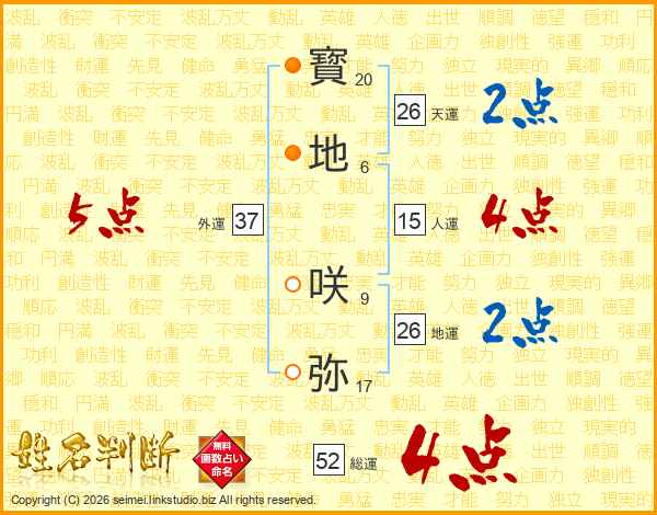 寳(20画)地(6画) 咲(9画)弥(17画)