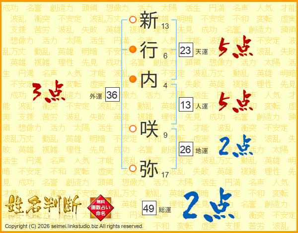新(13画)行(6画)内(4画) 咲(9画)弥(17画)