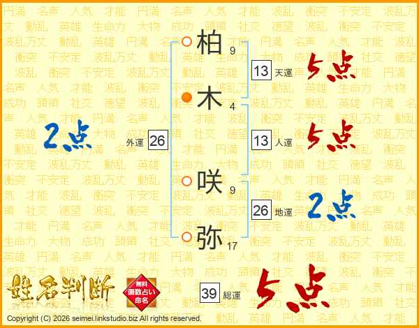 柏木咲弥さんの総運は39画の5点!