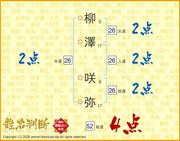 柳(9画)澤(17画) 咲(9画)弥(17画)