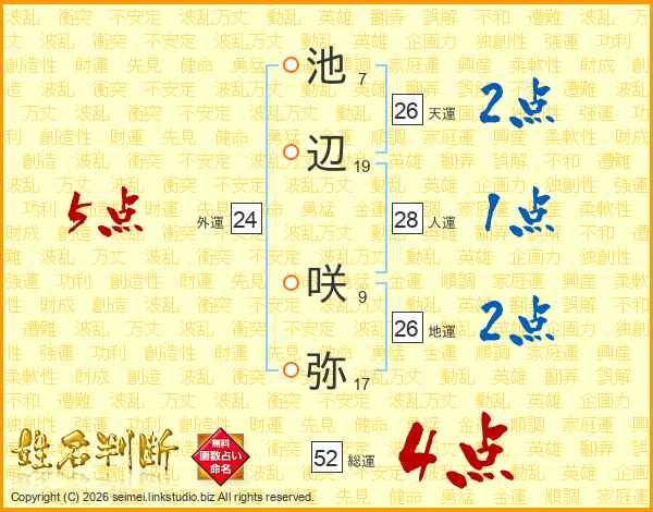 池辺咲弥さんの総運は52画の4点!