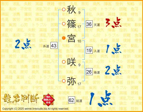 秋(9画)篠(17画)宮(10画) 咲(9画)弥(17画)