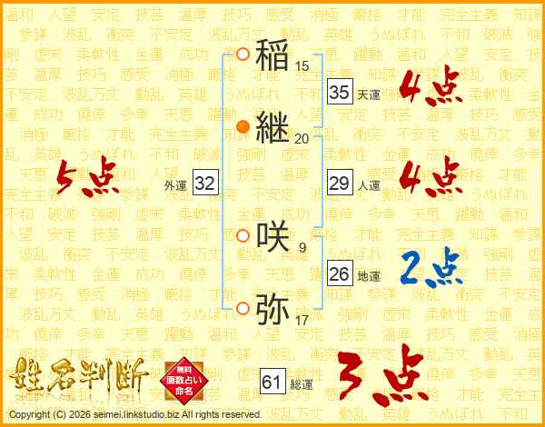 稲(15画)継(20画) 咲(9画)弥(17画)