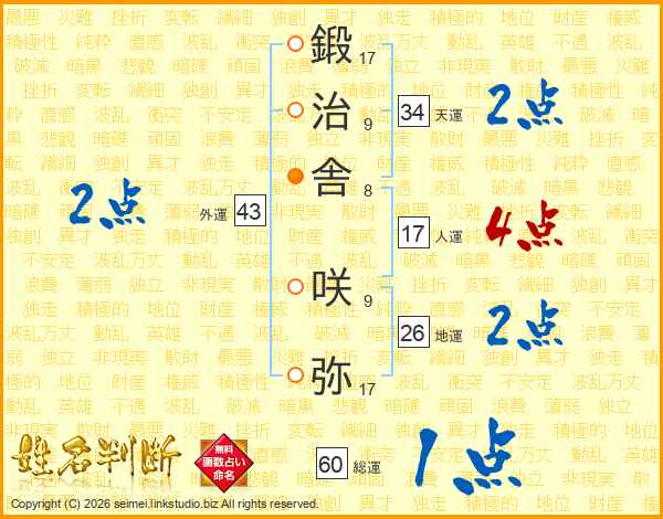 鍛(17画)治(9画)舎(8画) 咲(9画)弥(17画)