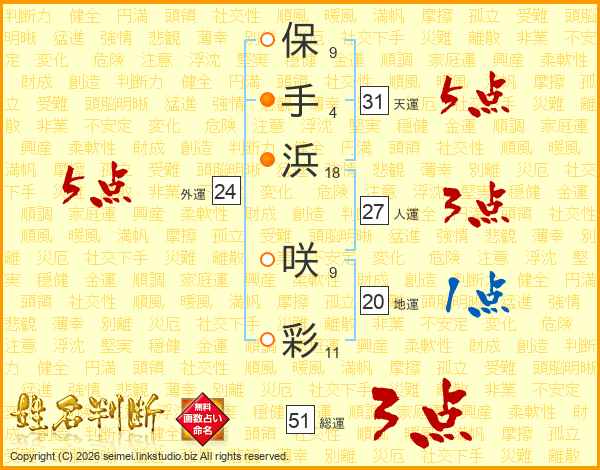 保手浜咲彩さんの総運は51画の3点!