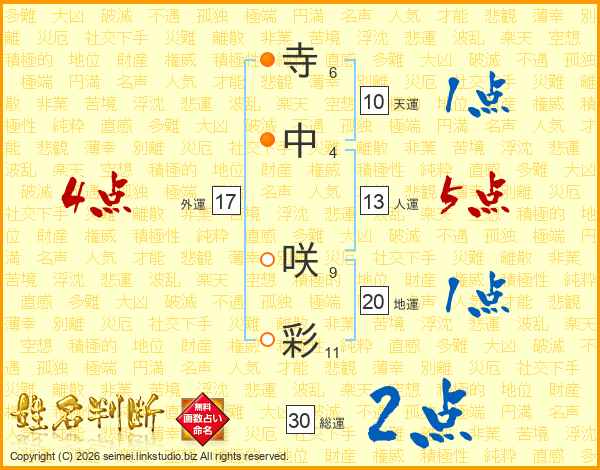 寺(6画)中(4画) 咲(9画)彩(11画)