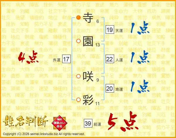 寺(6画)園(13画) 咲(9画)彩(11画)