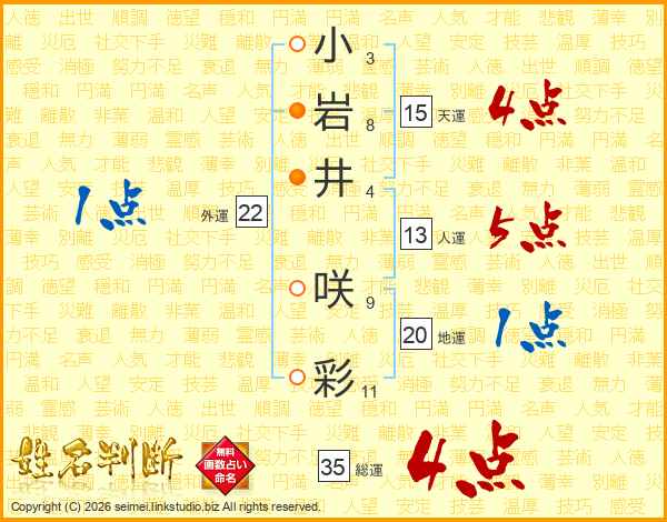 小(3画)岩(8画)井(4画) 咲(9画)彩(11画)