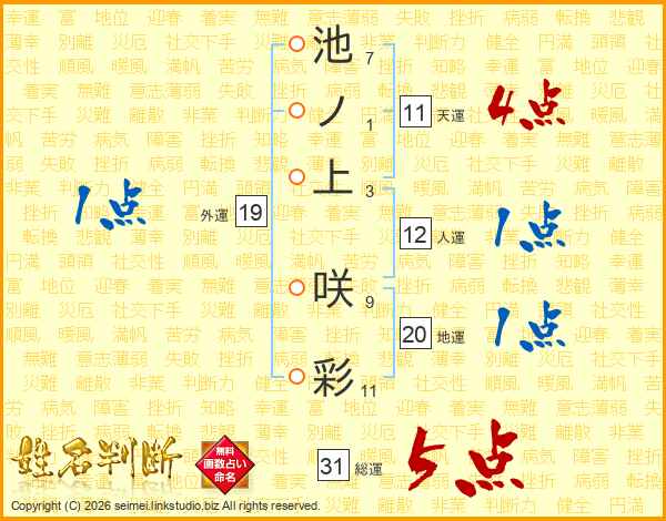 池(7画)ノ(1画)上(3画) 咲(9画)彩(11画)