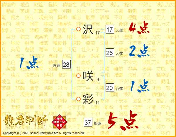 沢(17画) 咲(9画)彩(11画)