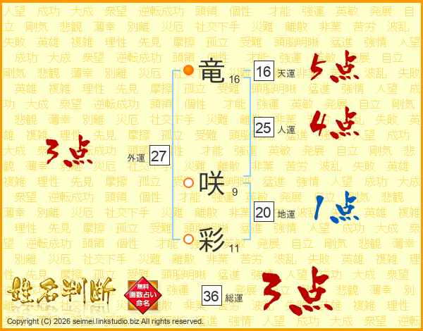 竜(16画) 咲(9画)彩(11画)