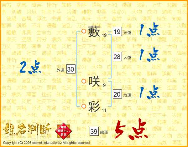 生活面を象徴する運勢です。外部から受ける影響力を表し、結婚運、家庭運や職場、環境への順応性を表します。総運から人運を引いた画数。姓や名が1文字の場合を除く。