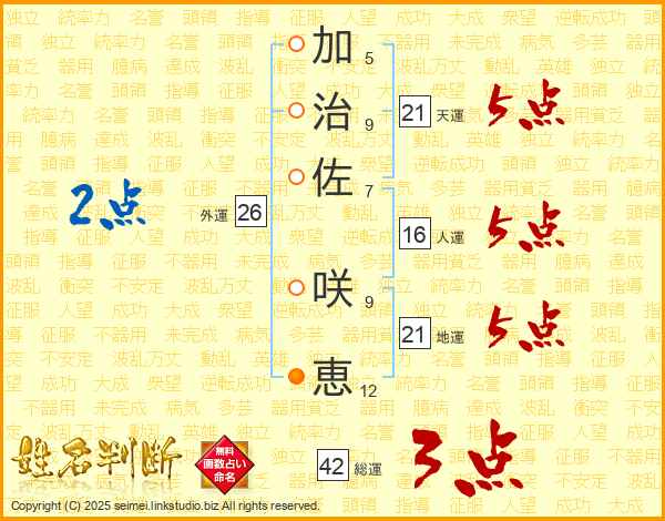 加(5画)治(9画)佐(7画) 咲(9画)恵(12画)