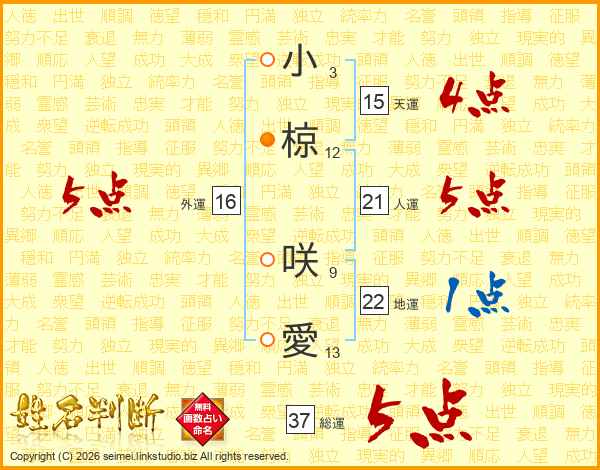 小(3画)椋(12画) 咲(9画)愛(13画)