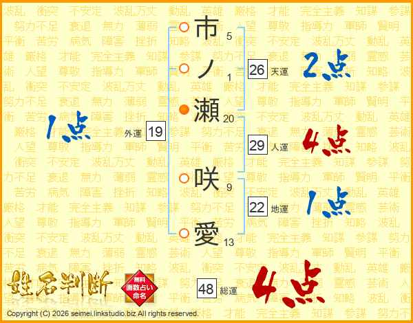 市ノ瀬咲愛さんの天運は26画の2点!