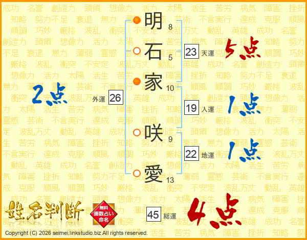 明(8画)石(5画)家(10画) 咲(9画)愛(13画)