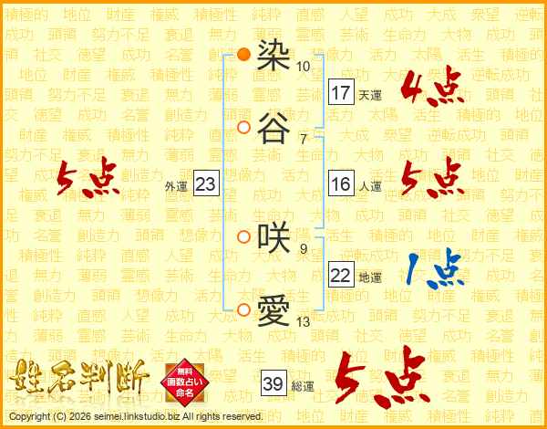 染(10画)谷(7画) 咲(9画)愛(13画)