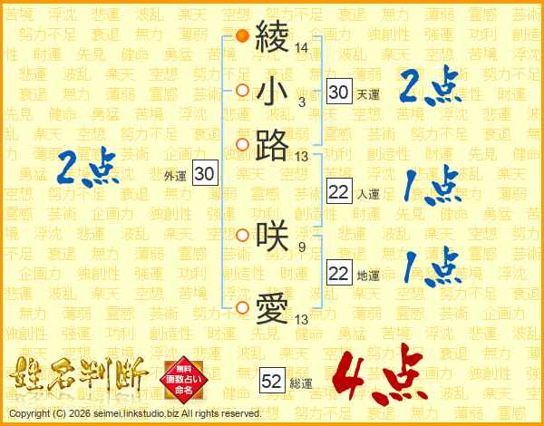 綾(14画)小(3画)路(13画) 咲(9画)愛(13画)
