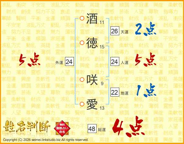 酒(11画)徳(15画) 咲(9画)愛(13画)