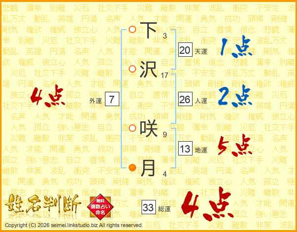 下沢咲月さんの総運は33画の4点!