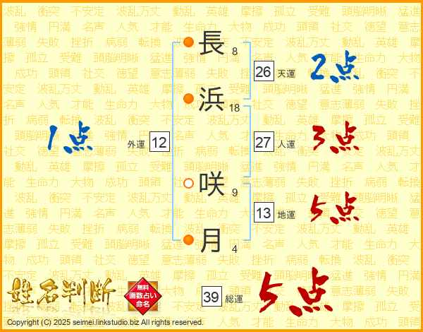 長浜咲月さんの総運は39画の5点!