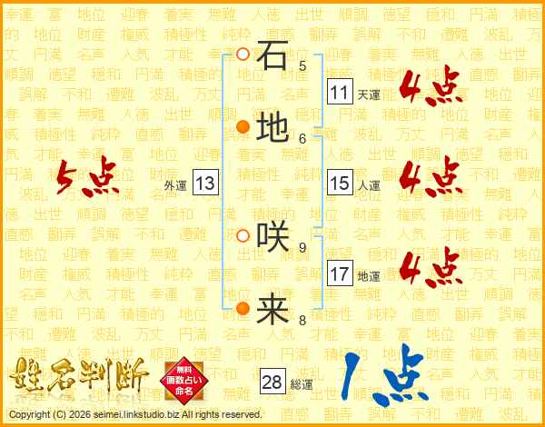 生活面を象徴する運勢です。外部から受ける影響力を表し、結婚運、家庭運や職場、環境への順応性を表します。総運から人運を引いた画数。姓や名が1文字の場合を除く。