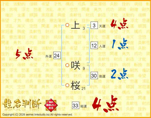 上咲桜さんの総運は33画の4点!