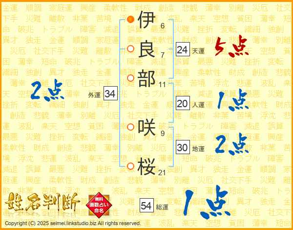 伊(6画)良(7画)部(11画) 咲(9画)桜(21画)
