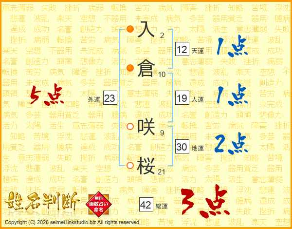入(2画)倉(10画) 咲(9画)桜(21画)