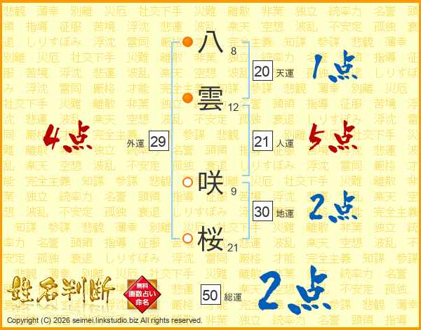 八(8画)雲(12画) 咲(9画)桜(21画)