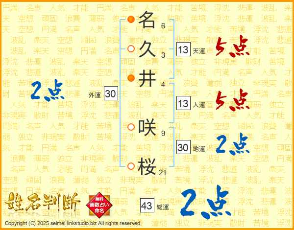名(6画)久(3画)井(4画) 咲(9画)桜(21画)