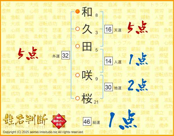 和(8画)久(3画)田(5画) 咲(9画)桜(21画)
