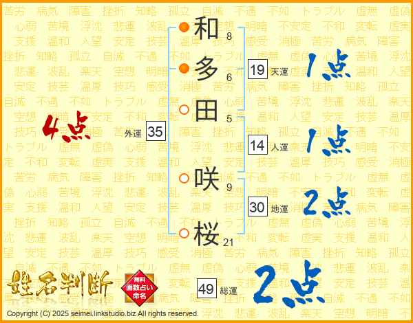 和(8画)多(6画)田(5画) 咲(9画)桜(21画)