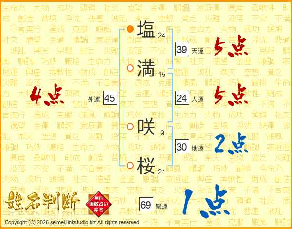 塩(24画)満(15画) 咲(9画)桜(21画)