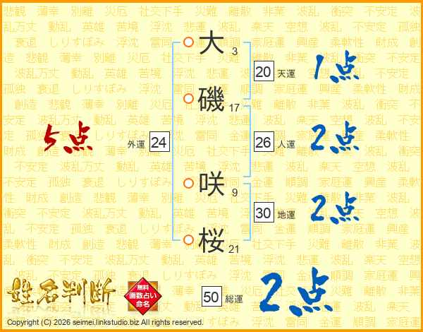 大(3画)磯(17画) 咲(9画)桜(21画)