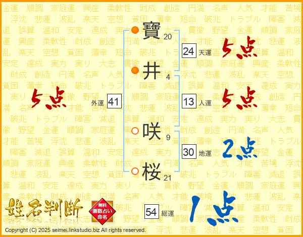 寶(20画)井(4画) 咲(9画)桜(21画)