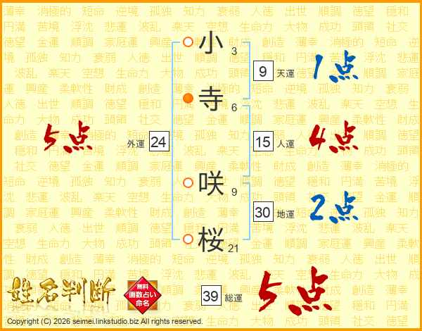 小寺咲桜さんの総運は39画の5点!