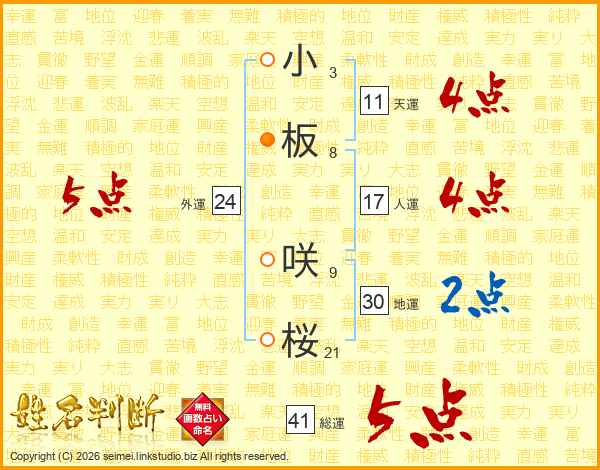 生活面を象徴する運勢です。外部から受ける影響力を表し、結婚運、家庭運や職場、環境への順応性を表します。総運から人運を引いた画数。姓や名が1文字の場合を除く。